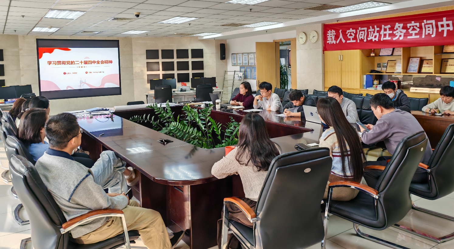 支部书记钟秋珍向全体党员讲党课,主题为《学习贯彻党的二十届四中全会精神》。整体学习了《中共中央关于制定国民经济和社会发展第十五个五年规划的建议》,重点学习了科技创新的引领作用,明确指出推动高质量发展,最重要是加快高水平科技自立自强,引领发展新质生产力,号召全体党员为加快抢占空间科技制高点贡献自己的力量。