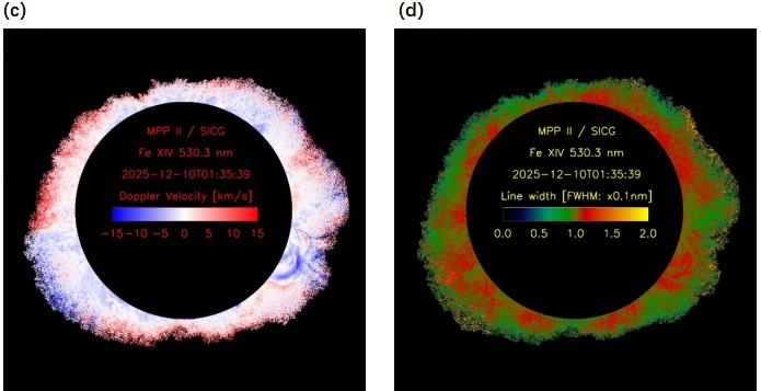 (a) Fe XIV 5303Å谱线强度图,可以有效探测温度为2MK左右的日冕;(b) Fe X 6374Å谱线强度图,可以有效探测温度为1MK左右的日冕;(c) Fe XIV 5303Å多普勒速度图,反映视线方向(LOS)的等离子体运动(单位为 km s⁻¹);(d) Fe XIV 5303Å谱线宽度图,其物理来源通常包含热展宽+非热展宽(波动/湍动/小尺度流动等)。[供图:山东大学(威海)空间科学与技术学院,付辉教授]