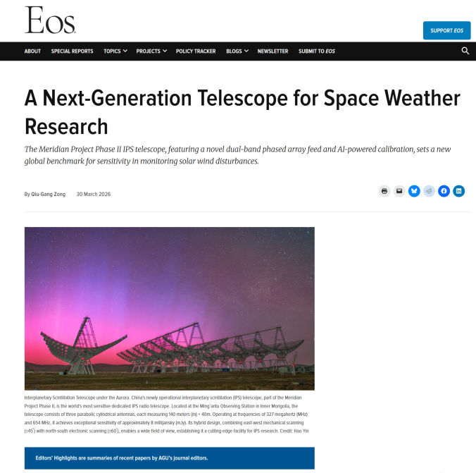 近日,子午工程行星际闪烁(IPS)望远镜团队取得的监测技术创新突破获得国际学术界高度关注。该研究首次将双频段、双极化多波束相控阵馈源(PAF)技术成功应用于子午工程IPS望远镜,并结合人工智能校准方法,为空间天气预报能力的跨越式发展奠定了关键技术基础。此项成果发表于美国地球物理学会(AGU)旗下期刊Journal of Geophysical Research: Space Physics,并被 AGU会刊Eos专文报道推介:“子午工程IPS望远镜采用新型双频段相控阵馈源与AI校准技术,为监测太阳风扰动树立了全球灵敏度新标杆。”这是子午工程二期通过国家验收一年来,科研成果连续第三次获国际学术界高度认可。