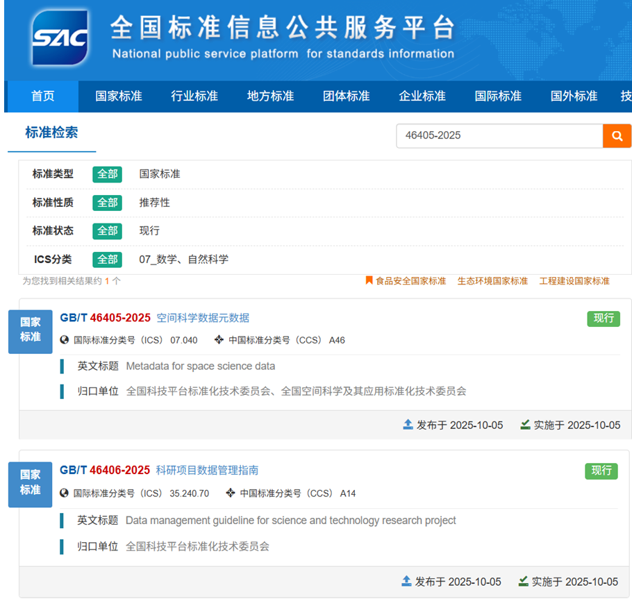 近日,国家标准化管理委员会通过官网发布《中华人民共和国国家标准公告(2025年第24号)》,由中国科学院国家空间科学中心国家空间科学数据中心牵头,联合国家科技基础条件平台中心、中国标准化研究院等20余家单位共同起草的GB/T 46405-2025《空间科学数据元数据》和GB/T 46406-2025《科研项目数据管理指南》等2项国家标准正式发布并实施。