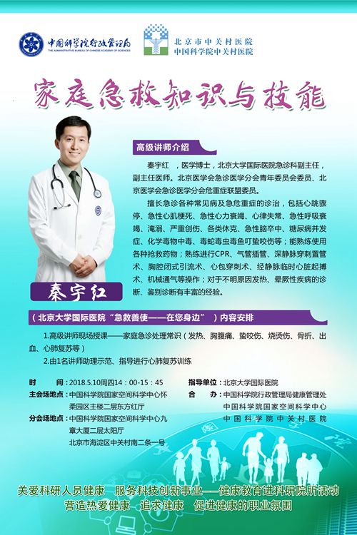 根据中科院党组“3H工程”的部署,为切实加强京区科研人员的医疗保健工作,倡导广大职工文明、健康、科学的生活方式,提高科研人员维护健康的能力,空间中心与中科院行政管理局健康管理处协同中关村医院联合举办健康讲座“家庭急救常识与技能-急救善使-在您身边”,该讲座由北京大学国际医院秦宇红博士为大家主讲,现场还会有1名讲师助理示范,指导心肺复苏训练。秦博士是北大国际医院急诊科副主任,擅长急诊各种常见病及危重症的诊治,包括心跳骤停,急性心肌梗死,急性心力衰竭,心律失常,急性呼吸衰竭,淹溺,严重创伤,各类休克,化学毒物中毒,毒蛇毒虫鱼叮蛰咬伤等等。此次健康讲座机会非常难得,讲座内容与大家的日常生活息息相关,十分受用,欢迎广大职工积极参与。