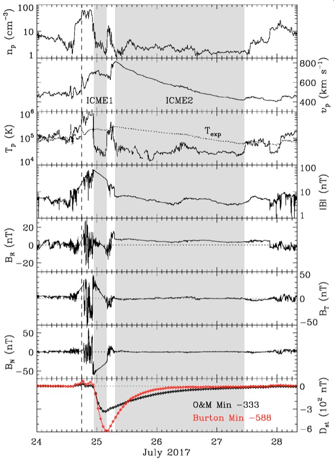 图2:1 AU处的太阳风就地观测。左:2012年7月事件;右:2017年7月事件。