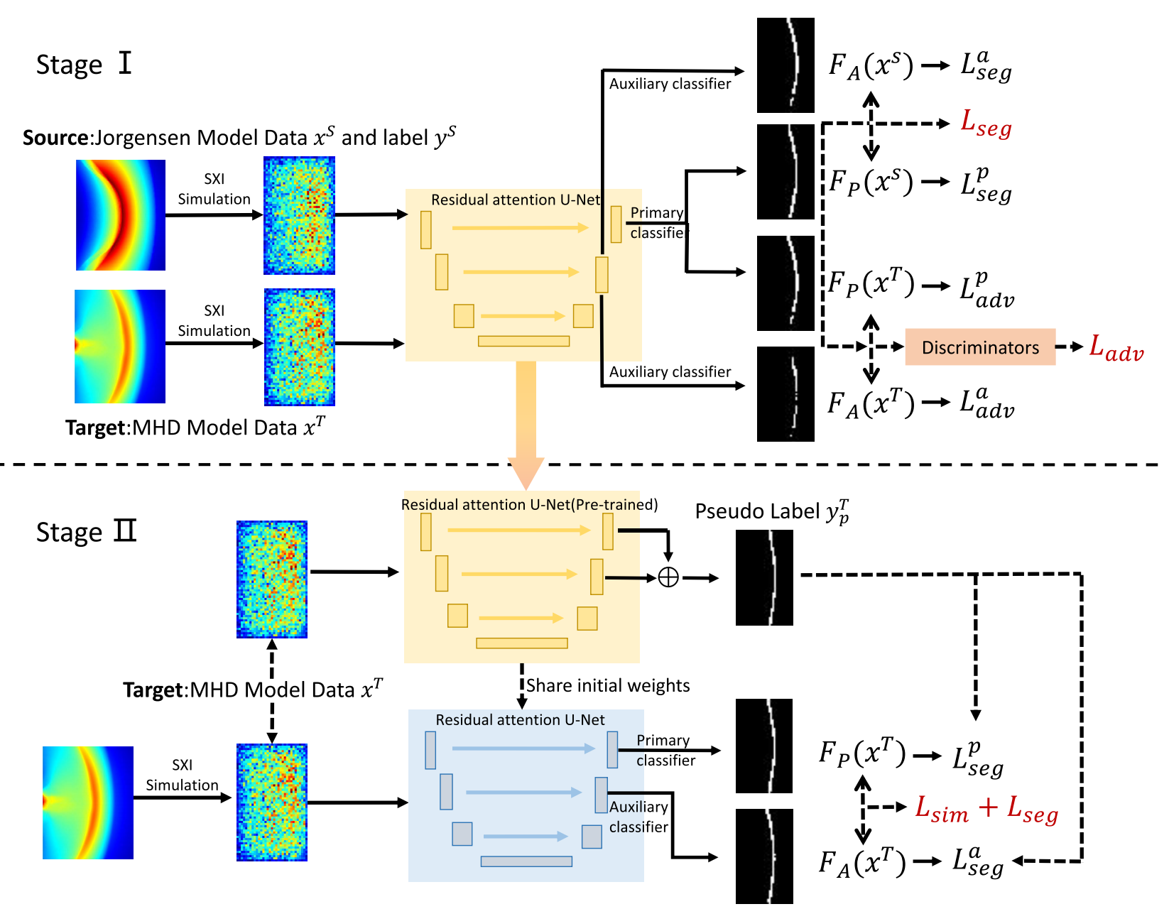 具体而言,本方法的网络架构如图2所示。首先,考虑到未来SMILE卫星获取的真实图像中磁层顶切线方向真值标注困难以及磁层软X射线发射理论模型输出与磁层实际软X射线发射之间固有的差异,提出了一种两阶段无监督域适应(UDA)训练策略。该策略使用Jorgensen & Sun模型作为源域数据,MHD模型作为目标域数据,通过使用辅助分类器、伪标签学习等技术,允许模型能够从源域模型微调到目标域模型,以便后续模型可以直接利用SMILE卫星发射后获得的真实数据进行训练,而无需进行真值标记,增强了在未来磁层顶切线方向检测工作的实际适用性。另外,卫星未来如果遇到低太阳风密度和不利观测视点的情况下,低信噪比 SXI 图像中的磁层顶切线方向检测将变得更具挑战性。为了解决这个困难,本方法提出的残差注意力U-Net网络架构使模型能够优先考虑磁层顶的形状细节,从而完善其模型的检测能力,保证了磁层顶的切线方向检测精度。最后通过对比、消融实验和 TFA 实验,一致证明了所提出的方法的有效性。
