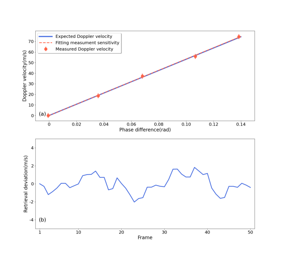 该光学干涉仪采用一体化集成设计,其光学元件由多种不同类型玻璃材料构成。研究团队通过科学设计并组合具有不同热膨胀系数的玻璃材料,有效降低了仪器对温度变化的敏感性,显著提升了其在复杂环境条件下大气风场探测的鲁棒性与稳定性。实验室测试结果表明,该干涉仪的空间频率和相位偏置与温度的敏感系数分别是:−0.038 cm−1/°C and 0.624 rad/°C。研究团队通过搭建实验室测风标定系统,评估了干涉仪的测风能力。实验数据显示,在五十次测量中,风速反演误差范围在−2 m/s 至 1.8 m/s(如图2所示)。