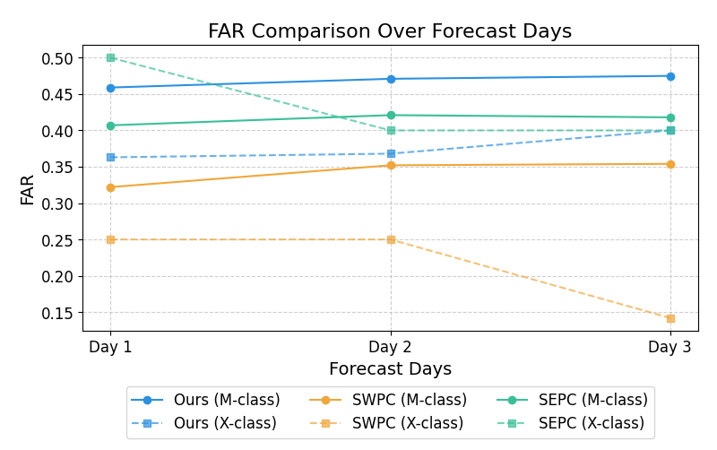 在2019-2024太阳活动从低谷上升至峰年期的预报评估中,模型的预测性能显著优于SWPC和SEPC业务模式,并在2024年5月的典型耀斑事件中成功实现72小时预警。