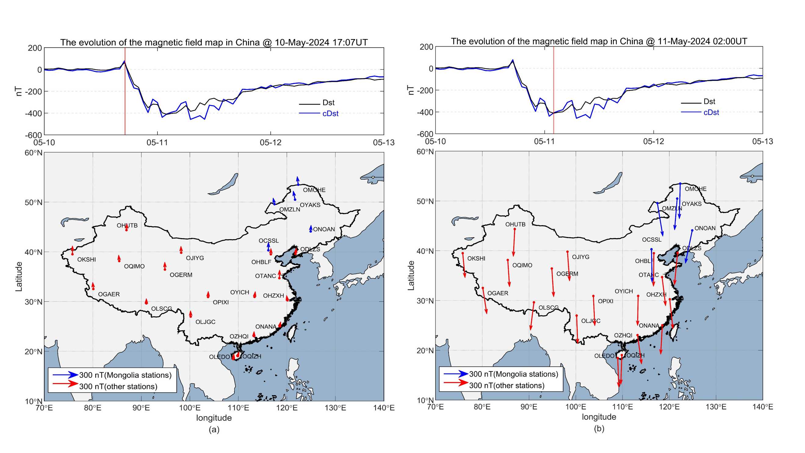 图1磁暴急始(a)和主相(b)期间,Dst指数、Cdst指数和我国区域地磁场水平分量的矢量变化