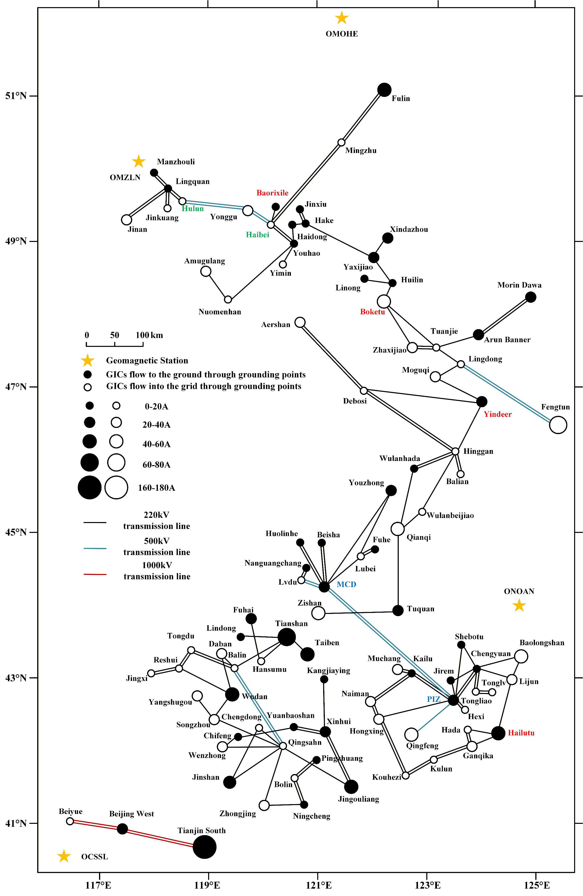 图2 磁暴期间,蒙东地区电网部分变电站最大GIC的空间分布