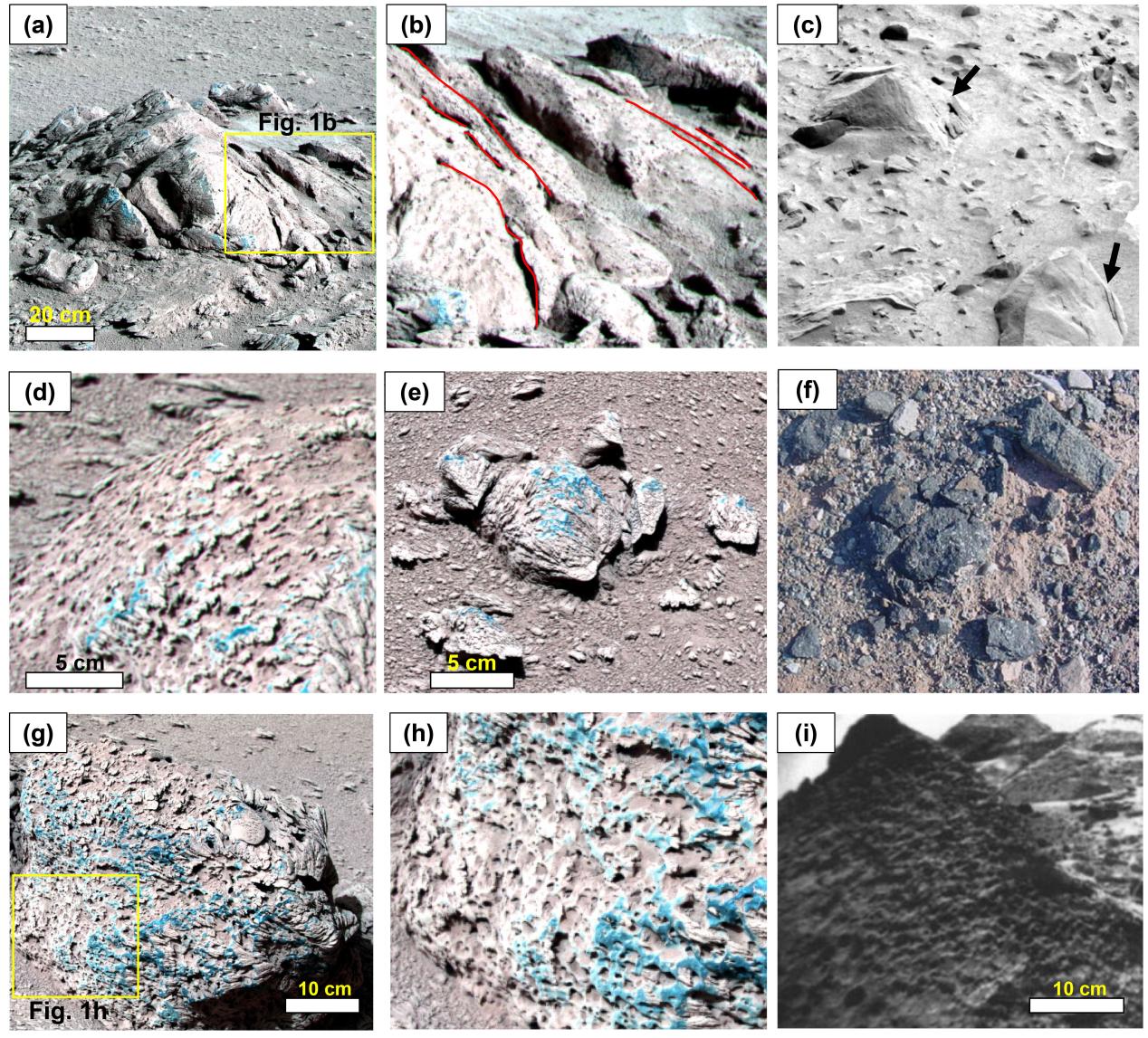 近日,中国科学院国家空间科学中心太阳活动与空间天气全国重点实验室刘洋研究员团队联合中国地质大学(武汉)、中国科学技术大学、香港大学与成都理工大学科研人员,基于我国祝融号火星车的原位观测数据展开系统研究。研究团队在沿途的岩石表面识别出近平行的片状剥落、彼此嵌合的碎裂块体以及密集分布的凹坑,这些形态特征与地球上的盐风化产物相似(图1)。