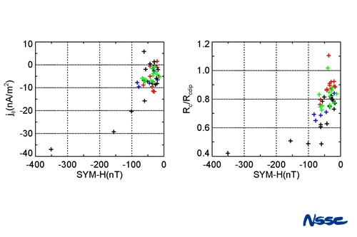 环电流(左)及磁场曲率(右)随磁暴强度变化的统计结果 |