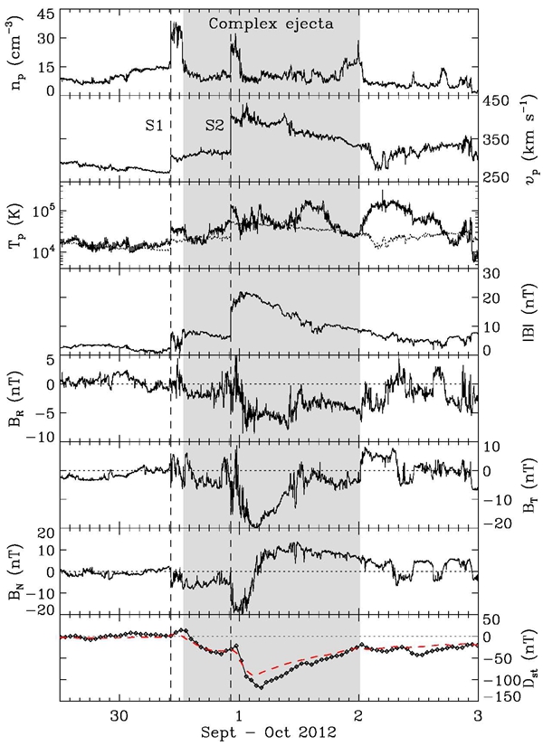 图二:Wind卫星观测到的地球附近太阳风特征,表现为具有规则磁场结构的复合抛射体,描述地磁暴的Dst指数呈现出“双步地磁暴”。