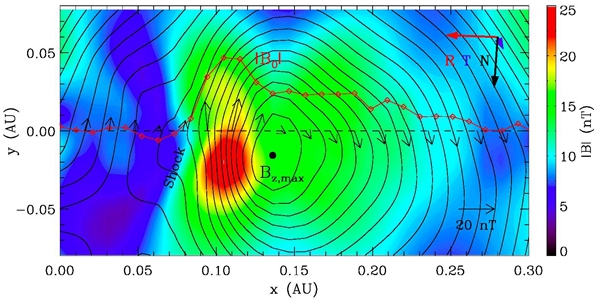 图三:利用太阳风观测数据的重构结果,揭示两个CME合并形成类似磁流绳结构的新型复合抛射体和内嵌的激波面。 |