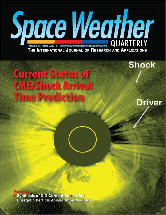 随后,赵新华副研究员与美国空间天气预报中心的M. Dryer博士合作撰文对当前CME/激波到达时间预报的研究进行了评述,回顾了到达时间预报的重要性和当前国际上主流的预报模型,重点介绍了空间天气学国家重点实验室自主开发的解析物理预报模式-SPM与SPM2模型,并对未来到达时间预报的发展方向进行了展望。M. Dryer博士是国际SOLTIP计划 (SOLar connection to Transient Interplanetary Phenomena) 主席,是“Space Weather”一词的首次使用者(Advances in Space Research, 2006, 37, 1261)。他领导团队开发的激波到达时间“无畏预报”(Fearless Forecast)模式组是国际上最有影响力的预报模型之一。这篇题为"Current status of CME/shock arrival time prediction" 的文章发表在国际学术期刊Space Weather上(2014年12卷7期),同时被收进该杂志2014年第2期的季刊,并荣登所在月刊和季刊的封面,表明我中心研究人员所开发的到达时间预报模式已具有一定的国际影响力。
