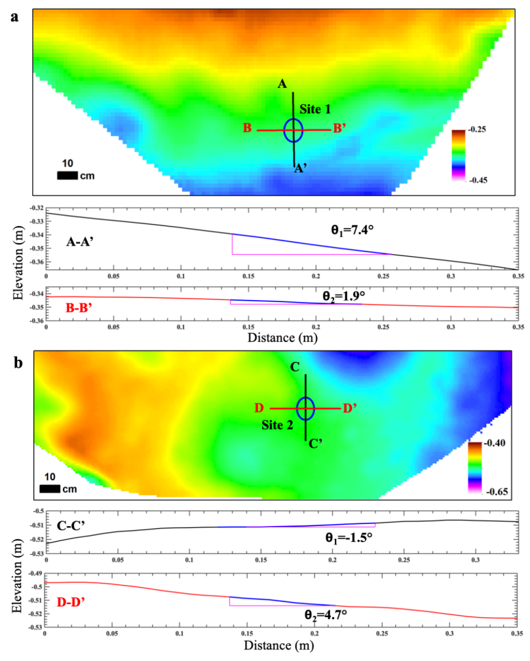 图二:测量月壤区域的高程(DEM)及平行和垂直于月球车观测方向的坡度