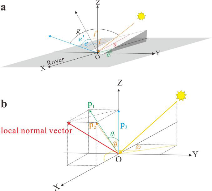 近期,中科院国家空间科学中心空间天气学国家重点实验室刘洋研究员与中科院地质与地球物理所林杨挺研究员团队合作,基于嫦娥四号可见光和近红外光谱数据,研究了原始状态下月壤的光度特性。在第十个月昼的科学探测中,玉兔二号一天保持不动,利用携带的可见光和近红外成像光谱仪对同一月壤区域进行了探测(如图一所示),并通过太阳的升落调节了观测的几何配置。由于月球表面有许多大小不一的撞击坑,月球表面也因此崎岖不平,而地形的起伏会极大地改变局地光照和仪器观测角度。利用月球车携带的避障相机的立体成像,研究团队生成了光谱测量区域的DEM数据,计算出了垂直于月球车观测方向坡度(如图二所示),并推导出了受地形影响后的角度与原始角度之间的关系公式(如图三所示),最终基于此关系和坡度值,对光谱进行了地形校正。
