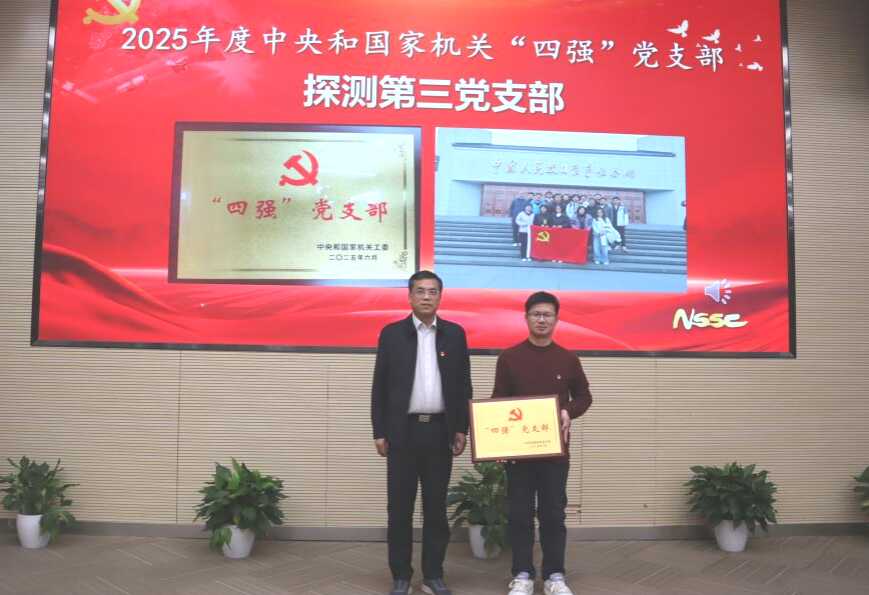 王赤为获得中央和国家机关“四强”党支部的探测第三党支部颁发奖牌;申倚敏和白鹭为荣获中央和国家机关“四好”党员的邓丽等9名同志颁发证书。