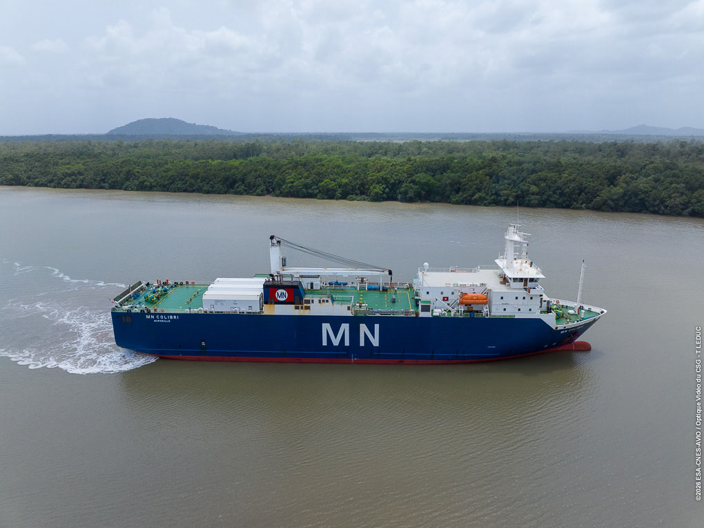 “微笑卫星”任务自2025年10月28日通过中欧联合出厂评审后,全面进入发射实施阶段。2025年11月底,卫星所需推进剂从上海启运,于2026年2月初运抵库鲁码头并转运至发射场。2026年2月11日,正样星及地检设备从位于荷兰的欧洲航天技术中心出发,从阿姆斯特丹码头搭乘“蜂鸟号”货轮横穿大西洋,于2026年2月26日抵达库鲁码头并顺利转运至发射场。