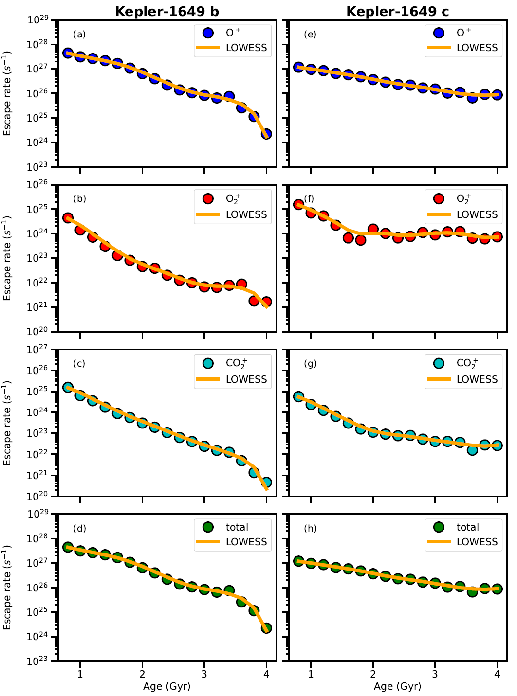 图2 Kepler-1649 b(左)和 c(右)离子逃逸率随恒星年龄(0.8–4.0Gyr)的演化。从上到下:氧原子离子O⁺、氧分子离子O₂⁺、二氧化碳离子CO₂⁺和总离子逃逸率(s⁻¹)。数据点使用 LOWESS 方法进行了非参数回归(实线)。