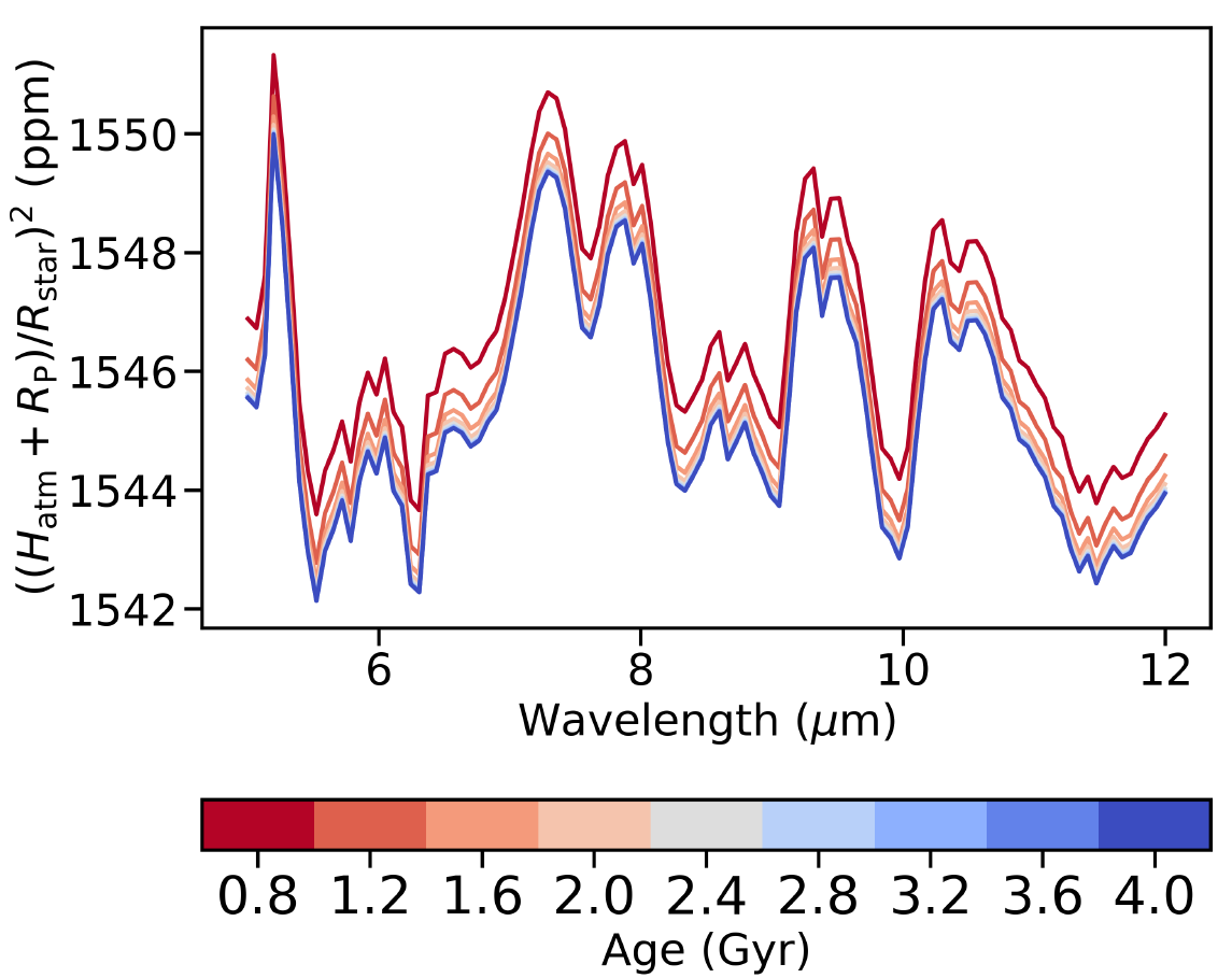 图7 Kepler-1649 b 在从0.8到4.0Gyr的九个代表性演化年龄下的红外凌星透射光谱(5-12µm)演化预测。Rp是行星的固体半径,Hatm是大气等效不透明高度,Rstar是恒星半径。