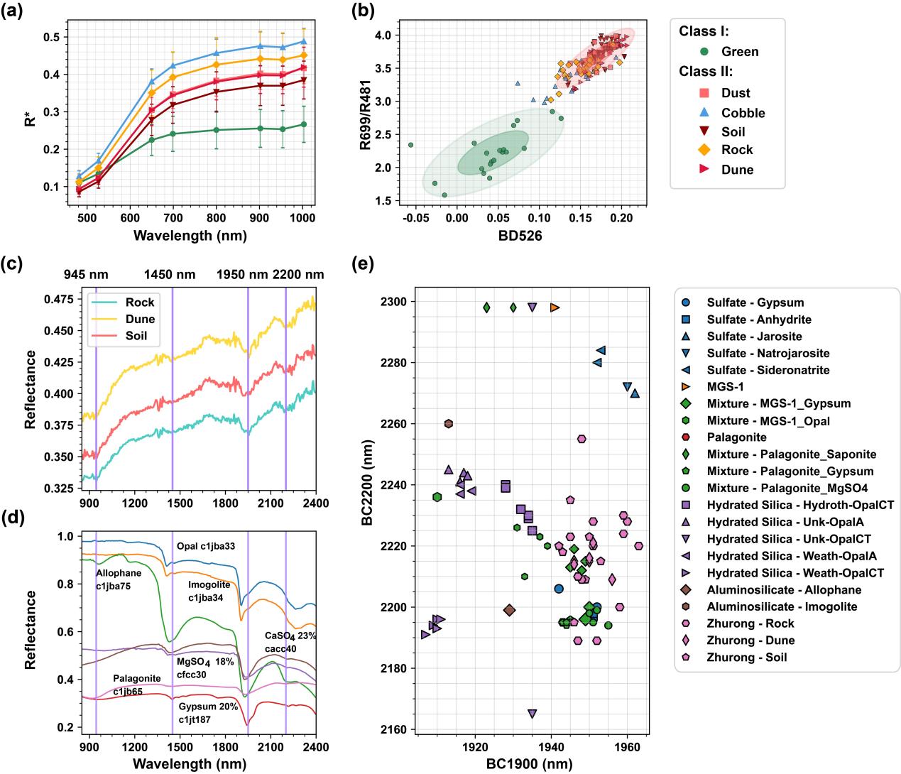 图2 祝融号就位(a-b)多光谱数据与(c-e)短波红外光谱分析。