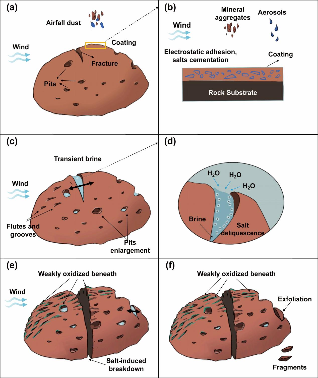 为评估盐类是否具备发生潮解条件,研究团队利用祝融号火星车的实测气象数据和火星气候数据库开展了模拟分析。模拟结果显示,在晚春至夏季期间,夜间至黎明前的近地表温度与相对湿度间歇性接近部分吸湿性盐类的潮解阈值,为这些时段内形成短时盐类溶液提供了理论可能。基于上述观测与模拟,研究团队提出火星尘埃中的盐分在岩石表面沉积和吸附,并在适宜的温湿度条件下发生潮解形成微量卤水,在后续蒸发过程中盐分重新结晶,产生的结晶压力会逐步破坏岩石结构,最终塑造了祝融号观测到的岩石表面纹理(图3)。